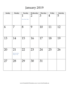Prepare for the New Year, the start of the fiscal year and winter fun with this printable January calendar for 2019, oriented vertically. Free to download and print.